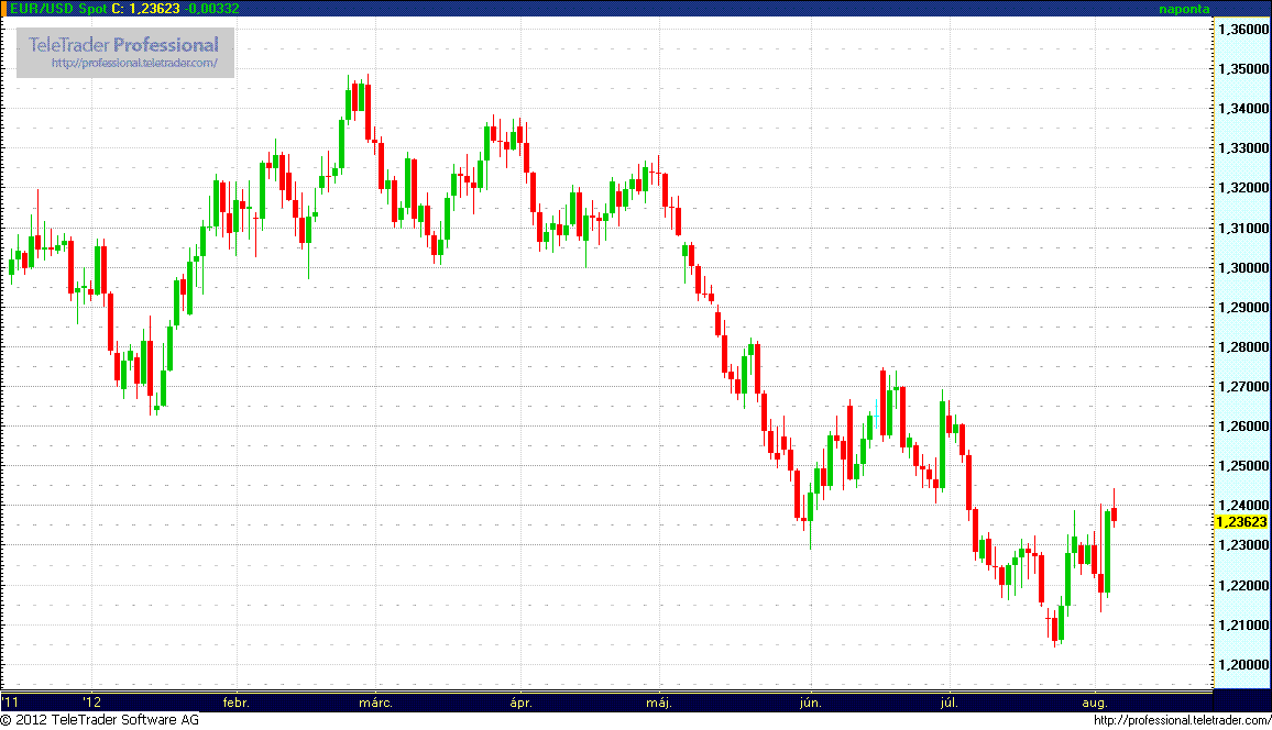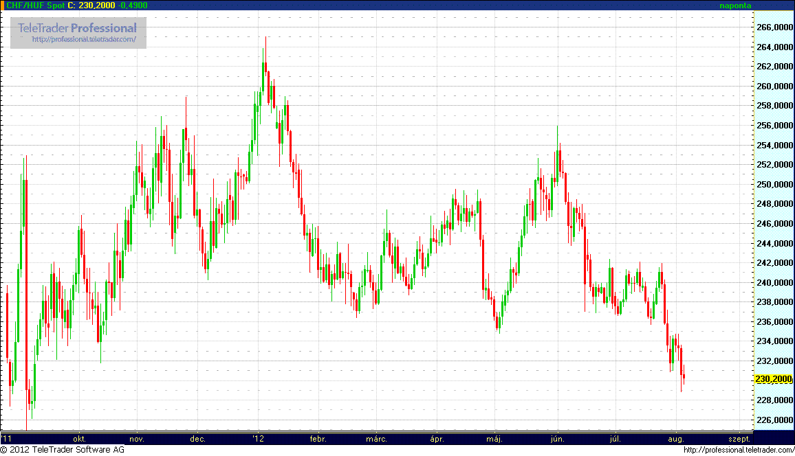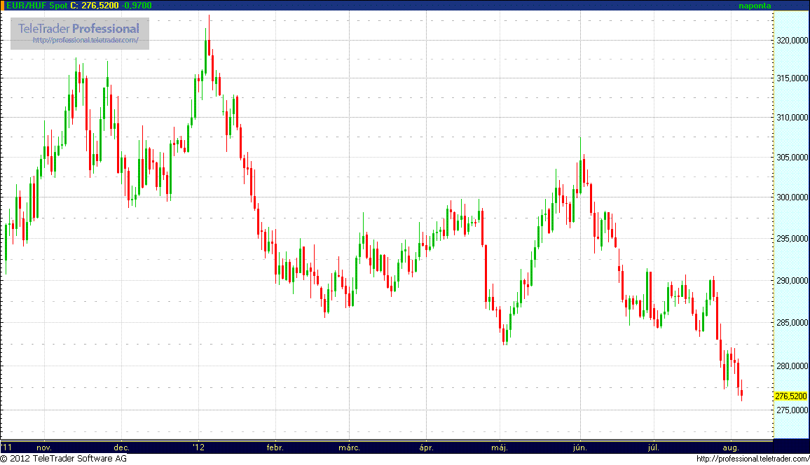 EUR/HUF (276,25 – 279,50): Az év harminckettedik hetén is erős szinten, 278-nál indul a kereskedés, ami tovább tartó jó hangulatot sejtet. A múlt hét végén a pozitív amerikai foglalkoztatottsági adatok tartják erősen a forint, és persze a cseh korona, és főleg a zloty árfolyamát. A pénteki másodpiaci kötvényhozamok mérsékelt elmozdulásokat produkáltak csupán, a CDS-felárunk viszont újabb idei mélypontra esett, egészen pontosan 454,39 bázispontra. Van még némi potenciál a kötvényhozamok, a csődbiztosítás, és az EUR/HUF árfolyam esésében, de ahhoz az EU-nak, illetve az ECB-nek kézzelfogható terveket kellene felmutatniuk a válságkezelés terén. A csütörtöki Draghi beszéd csupán ideiglenes megnyugvást hozott, a tartós stabilizációhoz több konkrétum, és gyors cselekvés szükséges.