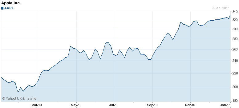 A 100 vezető technológiai részvényt összefogó Nasdaq 100 index közel 10 éves csúcsra került, elsősorban annak a hatására, hogy az Apple árfolyama rekordszintre nőtt, 330,20 dolláron jegyezték. Az Apple árfolyama 56 százalékkal nőtt 2009 vége óta.
