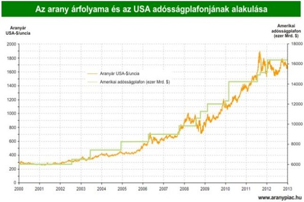 Az USA bruttó államadóssága az óév végére elérte a 16,4 billió dolláros adósságplafont, amelynél nagyobbra elméletileg nem nőhet az ország tartozása. Erről a pénzügyminiszter levélben tájékoztatta az amerikai törvényhozás vezetőit, és egyben rendkívüli intézkedéseket foganatosított, hogy legalább február végéig fedezni tudja a rövidtávú kormányzati kiadásokat. Ha a következő hetekben a kongresszusi pártoknak nem sikerül megegyezni a hitelállomány további bővítésének lehetőségéről, akkor 2011 nyarához hasonlóan hamarosan ismét előállhat a technikai csőd veszélye, amely akkoriban az USA hitelét mind a hitelmenősítőknél, mind a befektetőknél alaposan megtépázta. Az aranyár azokban a napokban a felfokozott piaci feszültségek hatására történelmi magasságokba kúszott fel.