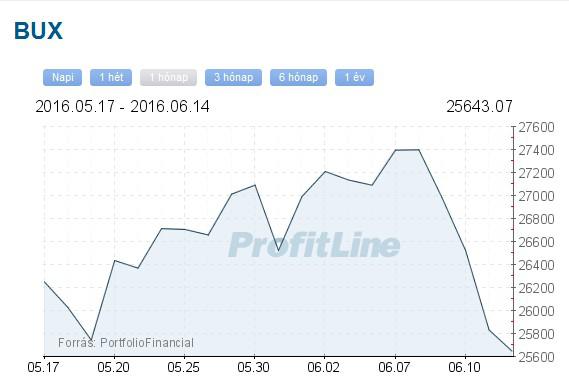 A Budapesti Értéktőzsde részvényindexe, a BUX 689,02 pontos, 2,60 százalékos csökkenéssel, 25 830,59 ponton zárt hétfőn. A Mol 395 forinttal, 2,40 százalékkal, 16 035 forintra csökkent, 1,6 milliárd forintos forgalomban. Az OTP-részvények ára 224 forinttal, 3,34 százalékkal, 6486 forintra esett, forgalmuk 5,3 milliárd forintot tett ki. A Magyar Telekom árfolyama 6 forinttal, 1,36 százalékkal, 436 forintra gyengült, forgalma 447,8 millió forint volt. A Richter-papírok árfolyama 135 forinttal, 2,49 százalékkal, 5285 forintra csökkent, a részvények forgalma 3,1 milliárd forintot ért el.