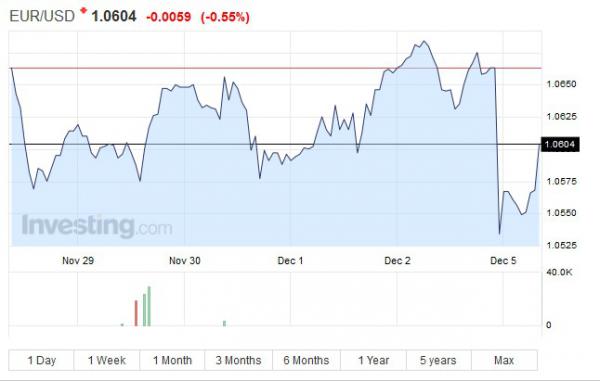 Az euró árfolyama 0,58 százalékkal, 1,0601 dollárra csökkent. A legalacsonyabb jegyzés hétfő hajnalban 1,0506 dollár volt, amely húszhavi mélypont.