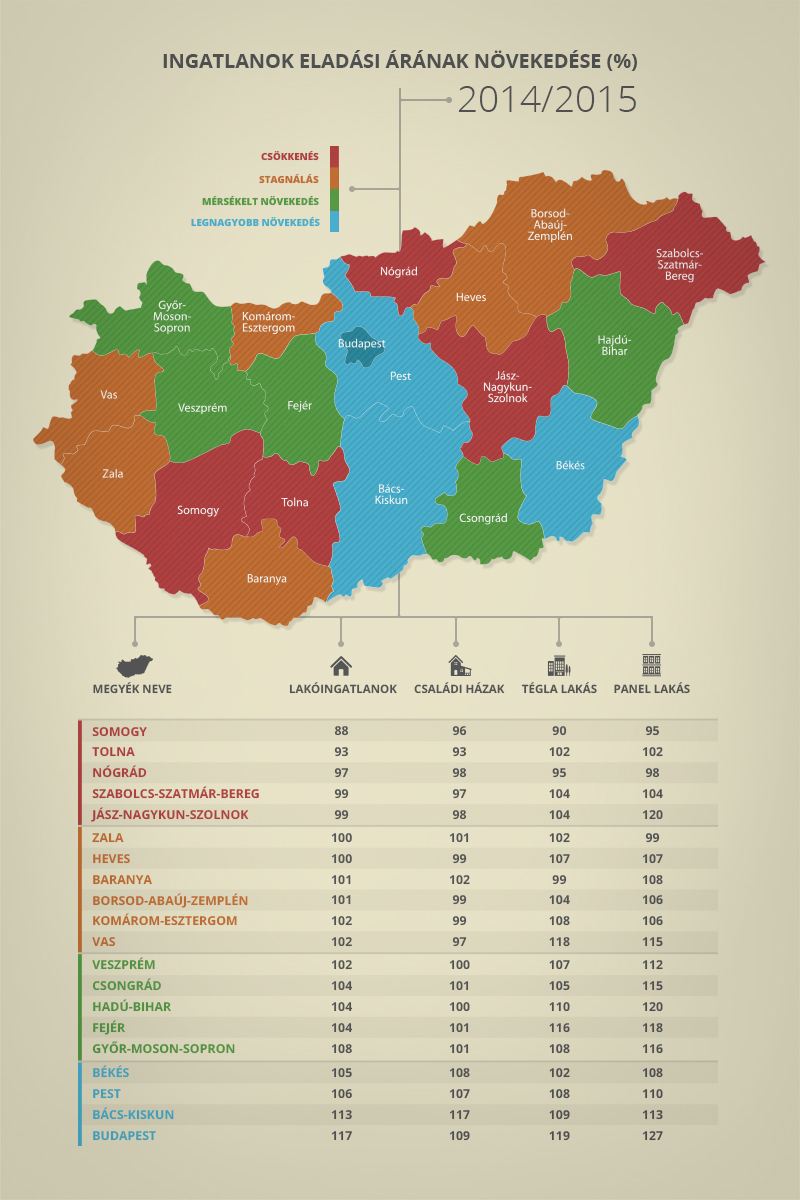Jellemzően a perifériális helyzetű megyékben a 2015-ös évben tovább csökkentek a lakóingatlanok árai, az ingatlanpiaci növekedés ellenére is. Somogyban 12%-kal, míg Tolnában 7%-kal csökkentek a lakóingatlanok eladási árai, de Nógrádban, Szabolcsban és Szolnok megyében is csökkenés figyelhető meg.