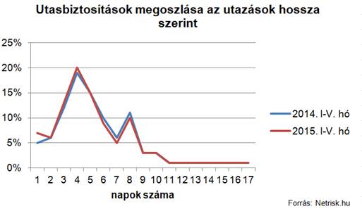 A biztosított utak leggyakoribb hossza 4, illetve 8 nap. Előző az úgynevezett hosszú hétvégéket felölelő utazások jellemző időtartama, míg utóbbi a hetes turnusokra jellemző 8 nap/7 éjszaka sémát követi. Pozitív fejlemény, hogy az össze utasbiztosítás közül a tavalyi 5-ről 7 százalékra nőtt az egynapos utakra kötött szerződések aránya, ami az ügyfelek tudatosságának javulását jelzi. Fontos ugyanis szem előtt tartani, hogy egy egynapos bécsi úton bekövetkező baleset vagy betegség nyomán a kórházi számla ugyanúgy több százezer forintot tehet ki, mint egy egyhetes nyaralás alatt felmerülő hasonló probléma esetében
