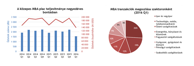 A kelet-közép-európai régióban a 2015 első negyedévében regisztrált 77-hez képest 33 százalékkal kevesebb, mindössze 52 közepes M&A tranzakció zajlott le az idei év első három hónapjában, melyek összértéke 3,5 milliárd dollár volt. Ezen belül ugyanakkor 11 százalékkal nőtt a magántőke szerepe: a tavaly első negyedévi 484 millióról 536 millió dollárra, ami az összes tranzakció több mint 15 százalékát jelenti (szemben az egy évvel ezelőtti 10 százalékkal).