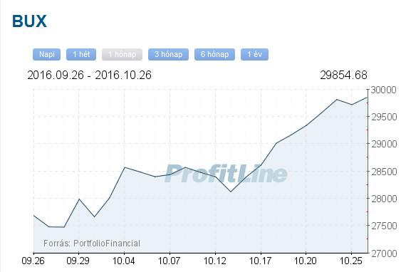 A Budapesti Értéktőzsde részvényindexe, a BUX 135,32 pontos, 0,46 százalékos emelkedéssel, 29 854,68 ponton, újabb éves csúcsán zárt szerdán. A részvénypiac forgalma 9,0 milliárd forint volt. A Mol 305 forinttal, 1,69 százalékkal 18 355 forintra erősödött, 1,7 milliárd forintos forgalomban. Az OTP-részvények ára 4 forinttal, 0,05 százalékkal 7846 forintra csökkent, forgalmuk 4,8 milliárd forintot tett ki. A Magyar Telekom árfolyama 3 forinttal, 0,64 százalékkal 470 forintra nőtt, forgalma 135,4 millió forint volt. A Richter-papírok árfolyama nem változott 6025 forintot ért, a részvények forgalma 2,2 milliárd forintot ért el.
