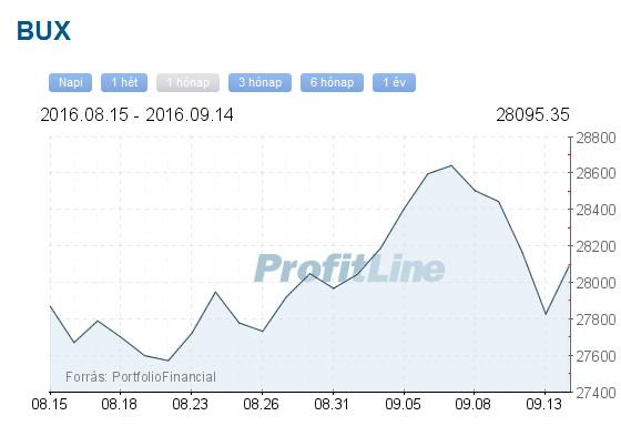 A Budapesti Értéktőzsde részvényindexe, a BUX 267,34 pontos, 0,96 százalékos emelkedéssel, 28 095,35 ponton zárt szerdán. A Mol 335 forinttal, 2,00 százalékkal 17 090 forintra erősödött, 1,3 milliárd forintos forgalomban. Az OTP-részvények ára 43 forinttal, 0,59 százalékkal 7324 forintra nőtt, forgalmuk 3,7 milliárd forintot tett ki. A Magyar Telekom árfolyama 2 forinttal, 0,45 százalékkal 443 forintra csökkent, forgalma 456,7 millió forint volt. A Richter-papírok árfolyama 57 forinttal, 1,00 százalékkal 5769 forintra emelkedett, a részvények forgalma 579,2 millió forintot ért el.