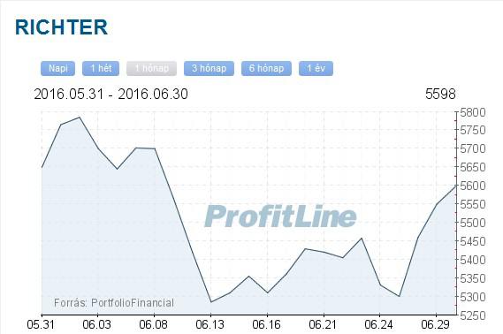 A Richter-papírok árfolyama 90 forinttal, 1,65 százalékkal 5550 forintra emelkedett, a részvények forgalma 2,5 milliárd forintot ért el.