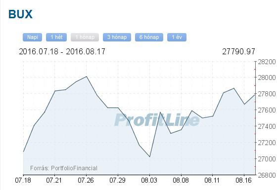 A Budapesti Értéktőzsde részvényindexe, a BUX 119,29 pontos, 0,43 százalékos emelkedéssel, 27 790,97 ponton zárt szerdán. A részvénypiac forgalma 6,3 milliárd forint volt. A Mol 200 forinttal, 1,16 százalékkal, 17 380 forintra erősödött, 999,4 millió forintos forgalomban. Az OTP-részvények ára 18 forinttal, 0,25 százalékkal, 7191 forintra nőtt, forgalmuk 4,0 milliárd forintot tett ki. A Magyar Telekom árfolyama 4 forinttal, 0,92 százalékkal, 440 forintra emelkedett, forgalma 126,7 millió forint volt. A Richter-papírok árfolyama 19 forinttal, 0,34 százalékkal, 5581 forintra csökkent, a részvények forgalma 1,1 milliárd forintot ért el.