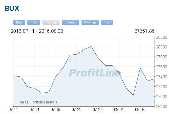 A Budapesti Értéktőzsde részvényindexe, a BUX 46,41 pontos, 0,17 százalékos emelkedéssel, 27 357,86 ponton zárt hétfőn. A Mol 15 forinttal, 0,09 százalékkal, 17 175 forintra erősödött, 784,5 millió forintos forgalomban. Az OTP-részvények ára 72 forinttal, 1,07 százalékkal, 6832 forintra nőtt, forgalmuk 2,2 milliárd forintot tett ki. A Magyar Telekom árfolyama 7 forinttal, 1,57 százalékkal, 438 forintra csökkent, forgalma 179,1 millió forint volt. A Richter-papírok árfolyama 15 forinttal, 0,26 százalékkal, 5725 forintra esett, forgalmuk 1,2 milliárd forintot ért el.