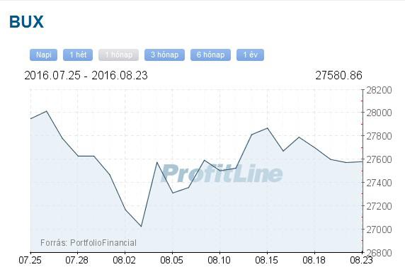 A Budapesti Értéktőzsde részvényindexe, a BUX 26,82 pontos, 0,10 százalékos csökkenéssel, 27 572,95 ponton zárt hétfőn, a részvénypiac forgalma 3,9 milliárd forint volt. A Mol 80 forinttal, 0,47 százalékkal 17 280 forintra erősödött, 818,8 millió forintos forgalomban. Az OTP részvények ára 60 forinttal, 0,84 százalékkal 7060 forintra csökkent, forgalmuk 2,3 milliárd forintot tett ki. A Magyar Telekom árfolyama 1 forinttal, 0,23 százalékkal 437 forintra nőtt, forgalma 91,0 millió forint volt. A Richter papírok árfolyama 14 forinttal, 0,25 százalékkal 5599 forintra emelkedett, a részvények forgalma 569,8 millió forintot ért el.
