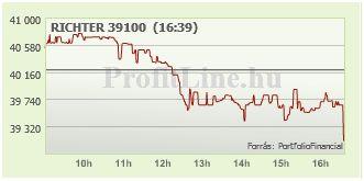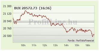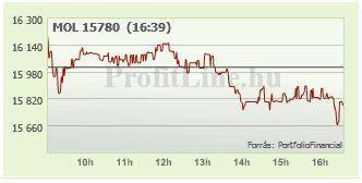 A Mol árfolyama 225 forinttal, 1,41 százalékkal 15.780 forintra csökkent, 2,1 milliárd forintos forgalomban.