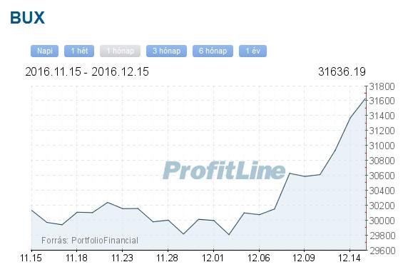A Budapesti Értéktőzsde részvényindexe, a BUX 261,91 pontos, 0,83 százalékos emelkedéssel, 31 636,19 ponton zárt csütörtökön, amely újabb történelmi csúcsot jelent. A részvénypiac forgalma 16,3 milliárd forint volt. A Mol 145 forinttal, 0,73 százalékkal 20 085 forintra erősödött, 5,4 milliárd forintos forgalomban. Az OTP-részvények ára 134 forinttal, 1,62 százalékkal 8383 forintra nőtt, forgalmuk 6,9 milliárd forintot tett ki. A Magyar Telekom árfolyama 3 forinttal, 0,62 százalékkal 489 forintra emelkedett, forgalma 343,6 millió forint volt. A Richter-papírok árfolyama 2 forinttal, 0,03 százalékkal 6183 forintra csökkent, a részvények forgalma 3,5 milliárd forintot ért el.