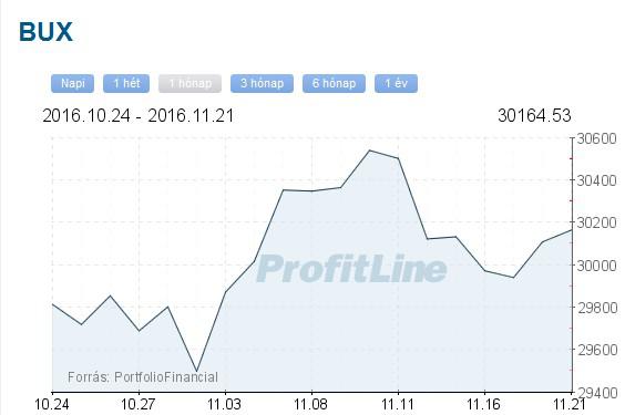 A Budapesti Értéktőzsde részvényindexe, a BUX 167,95 pontos, 0,56 százalékos emelkedéssel, 30 109,02 ponton zárt pénteken, a részvénypiac forgalma 10,1 milliárd forint volt. A Mol 165 forinttal, 0,90 százalékkal, 18 410 forintra erősödött, 918,1 millió forintos forgalomban. Az OTP-részvények ára 82 forinttal, 1,02 százalékkal, 8118 forintra nőtt, forgalmuk 3,8 milliárd forintot tett ki. A Magyar Telekom árfolyama 4 forinttal, 0,82 százalékkal, 481 forintra csökkent, forgalma 445,8 millió forint volt. A Richter-papírok árfolyama 8 forinttal, 0,14 százalékkal, 5858 forintra emelkedett, a részvények forgalma 4,8 milliárd forintot ért el.