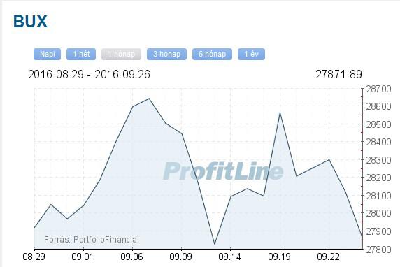 A Budapesti Értéktőzsde részvényindexe, a BUX 180,74 pontos, 0,64 százalékos csökkenéssel, 28 120,09 ponton zárt pénteken, a részvénypiac forgalma 5,9 milliárd forint volt. A Mol 90 forinttal, 0,53 százalékkal, 17 200 forintra erősödött, 1,9 milliárd forintos forgalomban. Az OTP-részvények ára 116 forinttal, 1,55 százalékkal, 7345 forintra csökkent, forgalmuk 2,8 milliárd forintot tett ki. A Magyar Telekom árfolyama 2 forinttal, 0,44 százalékkal, 454 forintra nőtt, forgalma 158,5 millió forint volt. A Richter-papírok árfolyama 65 forinttal, 1,13 százalékkal, 5675 forintra esett, a részvények forgalma 944,9 millió forintot ért el.
