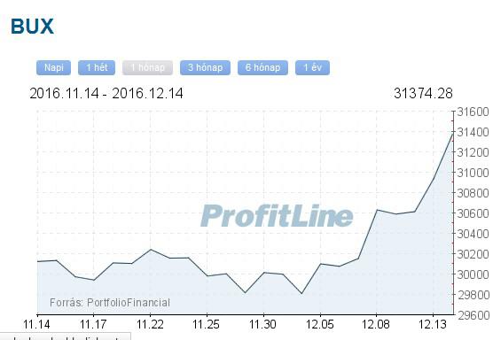 A Budapesti Értéktőzsde részvényindexe, a BUX 436,15 pontos, 1,41 százalékos emelkedéssel, 31 374,28 ponton, új történelmi csúcson zárt szerdán. A részvénypiac forgalma az átlagosnál jóval magasabb, 17 milliárd forint volt, a vezető részvények a Magyar Telekom kivételével erősödtek az előző napi záráshoz képest. A Mol 485 forinttal, 2,49 százalékkal 19 940 forintra erősödött, 3,9 milliárd forintos forgalomban. Az OTP-részvények ára 52 forinttal, 0,63 százalékkal 8249 forintra nőtt, forgalmuk 7 milliárd forintot tett ki. A Magyar Telekom árfolyama 3 forinttal, 0,61 százalékkal 486 forintra csökkent, forgalma 658,9 millió forint volt. A Richter-papírok árfolyama 141 forinttal, 2,33 százalékkal 6185 forintra emelkedett, forgalmuk 5,4 milliárd forintot ért el. A kis és közepes részvények indexe, a BUMIX 1899,89 ponton zárt szerdán, ez 10,29 pontos, 0,54 százalékos emelkedés a keddi záráshoz viszonyítva.