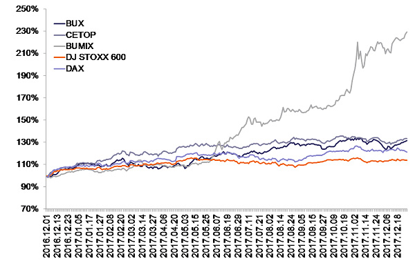 A BUX decemberben nem nyújtott kiegyensúlyozott teljesítményt. Az index a hónap során folyamatosan a 37-40 ezer pont között mozgott. Az év utolsó kereskedési napján, 2017. december 29-én volt a legmagasabb értékén, 39 377 ponton, azaz a BUX kis mértékű emelkedéssel zárta az első téli hónapot.
