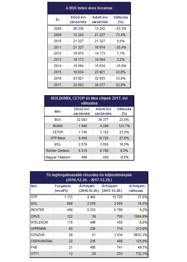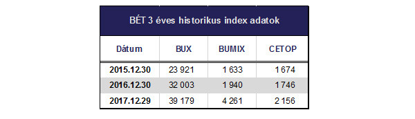 Szinte nem volt olyan hónap 2017-ben, mikor ne döntött volna újabb csúcsot a BUX index. Ha a historikus adatokat nézzük, akkor sem a BUMIX, sem a CETOP index nem panaszkodhatott. Ha csupán az utolsó három év záróértékeire tekintünk, akkor jól látható, hogy 2017-ben milyen dinamikusan növekedett az indexek értéke: