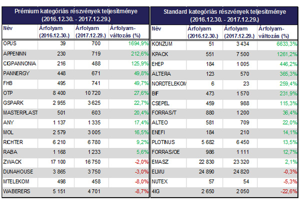 Prémium kategóriában a CIG Pannónia 47,9 százalékos emelkedéssel volt a hónap nyertese, őt követte a Pannergy (+24%), illetve az FHB (+10,6%). Standard kategóriában az Altera részvényárfolyama mutatott figyelemreméltó teljesítményt 2017 záró hónapjában, akinek papírja 57,9 százalékot emelkedett novemberhez képest. Ebben a kategóriában a második Konzum (+13,9%), a harmadik pedig az Alteo (+7,2%) lett.
