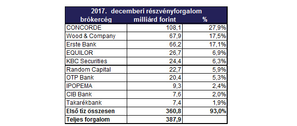 Az azonnali részvénypiac duplikált forgalma 387,9 milliárd forint volt (novemberben: 595,5 milliárd Ft). A szolgáltatók rangsorának élére decemberben a Concorde Értékpapír Zrt. lépett 108,1 milliárd forintos forgalommal, míg a második helyre Wood & Company Financial Services a.s. került 67,9 milliárdos forgalommal. A képzeletbeli dobogó harmadik fokát végül az Erste Befektetési Zrt foglalta el, 66,2 milliárd forintos forgalommal.