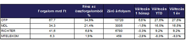 A vezető részvények közül az OTP árfolyama tudott csak emelkedni decemberben. A papír árfolyama 6,6 százalékkal nőtt az előző hónaphoz képest és 10 720 forinton zárta az első téli hónapot. Forgalom tekintetében az OTP-t a Richter (41,6 md Ft), a MOL (34,3 md Ft) és az OPUS (13,2 md Ft) követte, a Magyar Telekomban pedig 6,3 milliárd Ft-os forgalmat bonyolítottak a hónap során A három vezető papír árfolyama csökkent decemberben az előző hónaphoz képest (MOL: -1,5%; Richter: - 0,3%; MTelekom: - 2,8%).
