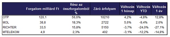 A forgalmi listán a megszokott szereplők és a megszokott arányok bukkantak fel. Az OTP részvényeire 120 milliárd forint értékben kötöttek üzletet, mögötte a MOL 38,8 milliárd forinttal, a Richter Gedeon (33,5 milliárd forint) és a Magyar Telekom (4,9 milliárd forint) foglalták el a forgalmi lista 2-4. helyeit.