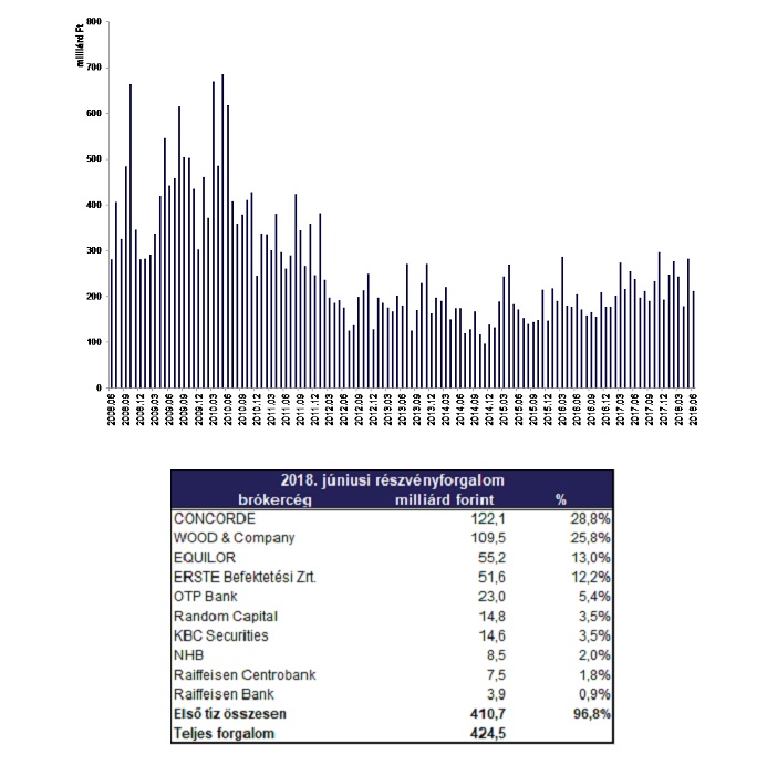 Az összesített forgalom ezúttal 212,2 milliárd forintra rúgott, ami a kiemelkedő májusi érték (282,7 milliárd forint) után némi visszaesés, de a 2017. júniusi adattól (237,6 milliárd forint) már alig maradt el.