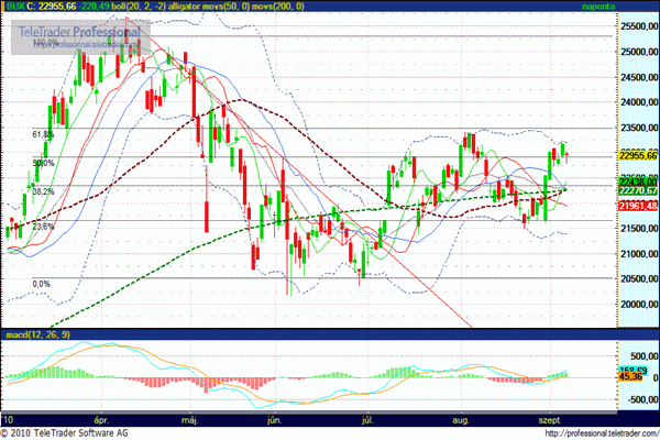 Mégsem tud olyan könnyen szabadulni az oldalazásból az árfolyam, tegnap nem sikerült megindulnia 23.500 pont felé, erre azért számítani lehetett, miután elég mélyről indult meg felfelé. Így lefelé indult, a csökkenést a nap végén sikerült ellensúlyozni, azonban így is 23.000 pont alatt zárt.