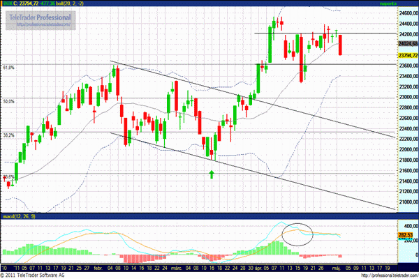 A tegnapi csökkenésből még messzemenő következtetést korai lenne levonni, hiszen az index maradt a 23.600-24.200 pontos sávon belül. A csökkenés azonban várhatóan folytatódik, az izgalmak pedig a sáv aljánál jöhetnek. A sávból történő letörés egyben a márciusi emelkedő trend törését is jelentené. Emelkedés során ellenállás 23.900-24.000 pontnál.
