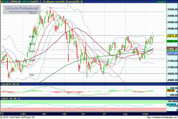 A hétvége eseményei újra lendületet adtak a piacnak, így ismét a 23.500 pontos ellenállási szinte elé került. A feladat továbbra is adott, át kell törnie az ellenálláson, ami jelent pillanatban karnyújtásnyi távolságra van.