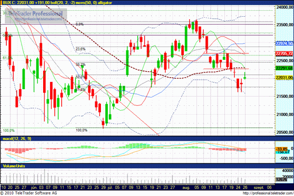 Emelkedés helyett véleményünk szerint inkább a 22.250 pont visszatesztelése történik, amely után újra lendületet vehet az esés. Támasz továbbra is 21.750 pontnál. Annak eleste után jöhet a nagy zuhé...