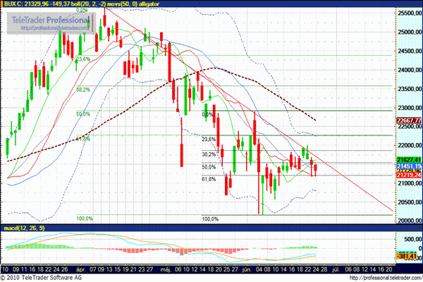 Egyre távolabbra kerül a 21.800 pontos szinttől, sőt már inkább a 21.200 pontos támaszát tesztelgeti. Ahogy az OTP-nél kitartott az 5040, úgy itt is kitartott csütörtökön a 21.200 pontos támasz.