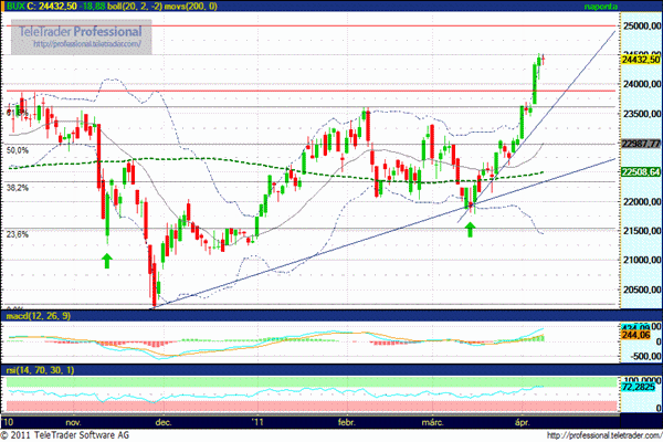 A 24.500 pontos szint pénteken is útját állta az emelkedésnek, így várhatóan a nemzetközi piacokhoz hasonlóan a magyar piac is lassítani kénytelen, a konszolidáció már-már elkerülhetetlenné vált. Csökkenés során támasz 24.200, illetve 23.900 pontnál.