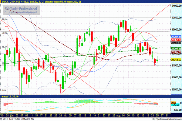 Ugyan kedden a 21,650 pontos támasza alatt zárt, de látható, hogy a tegnapi napon már visszahúzták fölé, így bent tudott maradni a 21.650-22.900 pontos sávban.