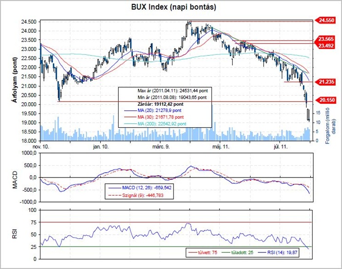 A 21.235 pontos támasz törése indította el a lavinát a BUX-ban. Az árfolyam ezt követően több mint 10%-ot veszített értékéből pár nap leforgása alatt. Múlt héten a 20.150 pontos szint is elesett, és így több ezer pontos tér nyílt lefelé - olvasható az Erste elemzésében.