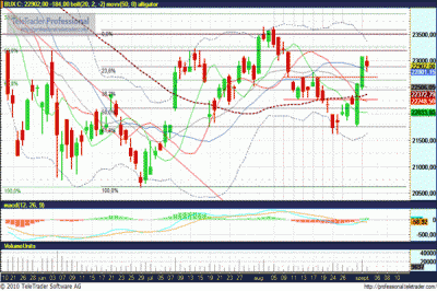 Várhatóan az amerikai foglalkoztatottsági adatokra adott piaci reakció fogja eldönteni az index további sorsát. Emelkedésben ellenállás 23.000 pontnál, míg támasz 22.700 pontnál.