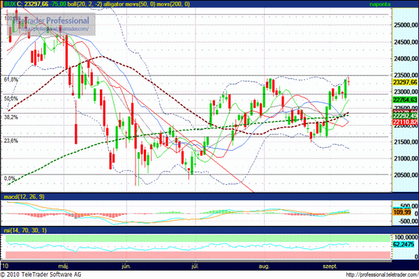 Elérte az index az ellenállási szintjét 23.500 pontnál, amelynek nyomán láthatóan elbizonytalankodtak a befektetők a "hogyan tovább"-ot illetően. A szerdai lendület elakadt az ellenállásban, ami nem csoda, hiszen nagy a tét.