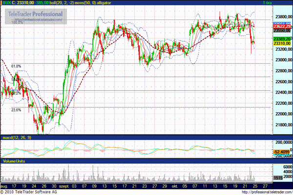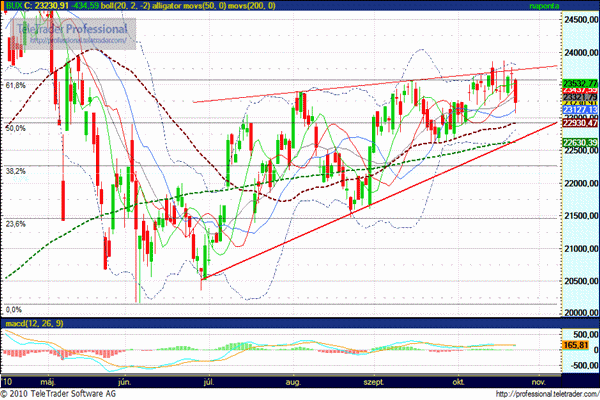 Október eleje óta kacérkodott a 23.750 pontos szint átlépésével, azonban a sok sikertelen próbálkozásnak pénteken már határozott esés lett a vége. Ugyan 23.300 pont felett meg tudott kapaszkodni, de ennek ellenére a támasz további tesztelésre számíthatunk.