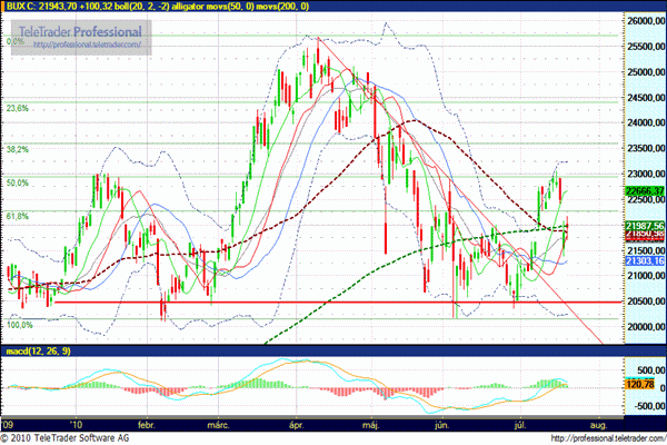Leginkább a grafikonon egy igen jelentős fej-váll alakzat jobb vállának kirajzolása mutatkozik, amelynek magassága szinte pontra megegyezik az év elején kirajzolódott bal váll magasságával. Csökkenésben támasz 21.400 és 20.500 pontoknál.