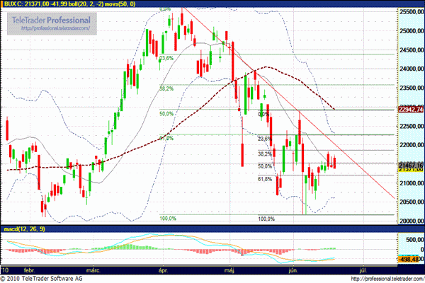 A csökkenő trendvonal eléréséig, azaz néhány napig továbbra is oldalazásra lehet számítani, melynek során támasz 21.200 pontnál mutatkozik.