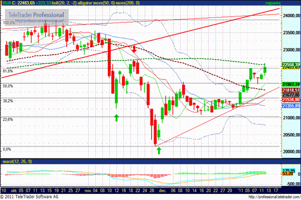 Folytatódott a lendületes emelkedés, ennek során már a 200 napos mozgóátlagot is elérte. A mozgóátlag jelentette ellenállás tavaly novemberben megállította, most viszont a piac lendületét elnézve könnyen lehet, hogy áttöri az árfolyam, pláne ha kap még egy kis "hátszelet" a nemzetközi piacok felől. Ha ez bekövetkezik, akkor megnyílik az út 23.500 és 23.870 pont irányába. Ellenállás 22.600 pontnál, míg komolyabb támasz 22.000 pontnál mutatkozik.