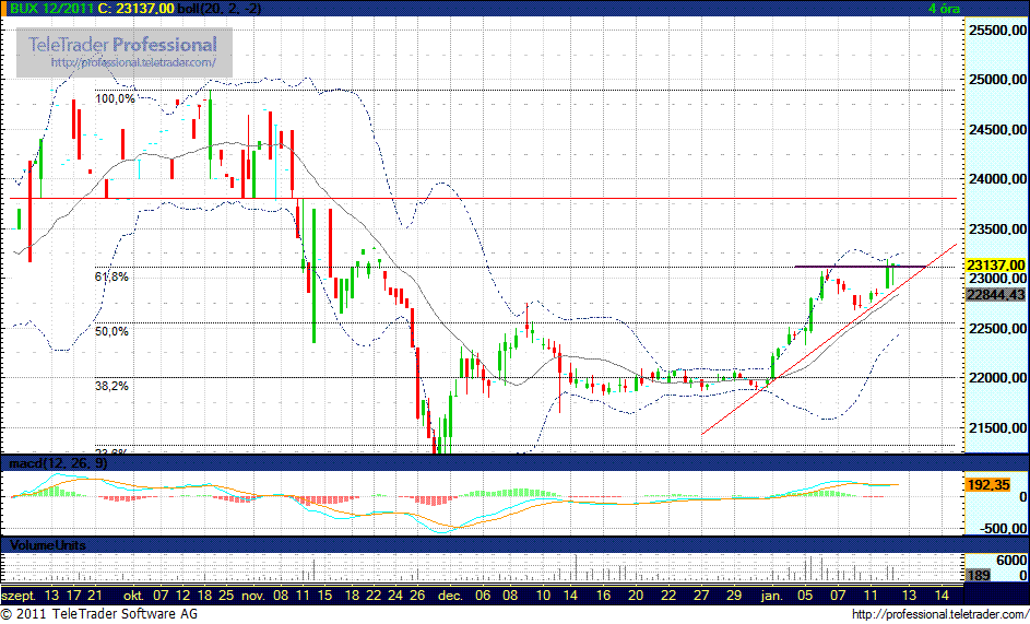 A decemberi konszolidációs szakasz óta bekövetkezett emelkedés nyomán már a 23.100 pontnál lévő ellenállási szintet ostromolja, ugyan a múlt héten visszafordult róla, és egészen 22.750 pontig csökkent. Most viszont már a nemzetközi piaci hangulat is kedvezőbb feltételeket nyújt annak áttöréséhez. Ha ez sikerült, akkor 23.800 pont környékéig könnyedén eljuthat. Támasz továbbra is 21.750 pontnál.