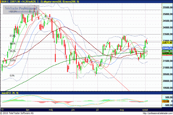 A BUX a múlt héten 847,53 ponttal, 3,85 százalékkal emelkedett, 22.871,90 ponton zárt pénteken. A vezető részvények közül az Egisnek és a Magyar Telekomnak mérséklődött az árfolyama, a többi blue chip nyereséggel zárta a hetet. A heti részvényforgalom 86,7 milliárd forintot ért el, míg az előző héten 98,6 milliárd forint értékben születtek üzletek. Az index a 2009. december végi 21.227,01 pontos értékénél jelenleg 1.644,89 ponttal, 7,75 százalékkal áll magasabban.