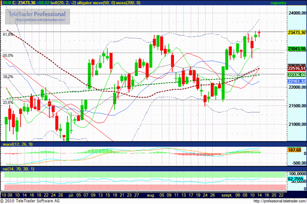 Csökkenés során a 23.350 pont eleste már figyelmeztető jel lehet. A héten folytatódhat a birkózás a piacon, talán a hét végére eldől, hogy folytatódhat-e az emelkedés. (Mindez persze nagyban függ az előttünk álló nemzetközi makrogazdasági adatok alakulásától, amiből lesz bőven a hét hátralévő részében)