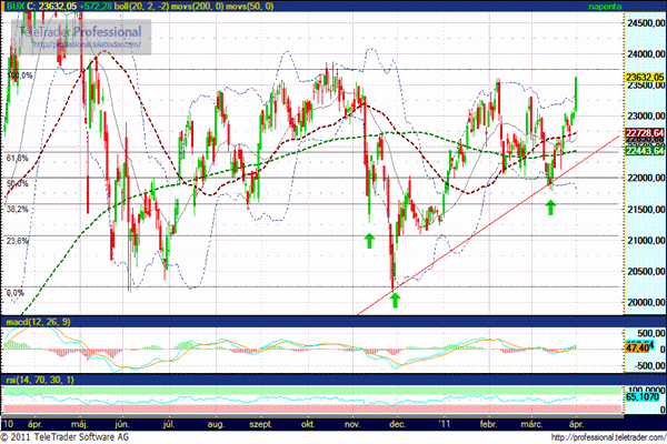 A múlt hét elején mutatkozó korrekciót az 50 napos mozgóátlag sikeresen megfogta, a szerdán újrainduló emelkedés a csütörtöki kisebb pihenő után pénteken nagy intenzitással folytatódott, melynek során az index túljutott a februári csúcson és megközelítette a tavaly októberben kialakult 22.750-22.850 pont közötti ellenállási zónát. A piaci emelkedés egyetlen szépséghibája mindössze az alacsony forgalom.