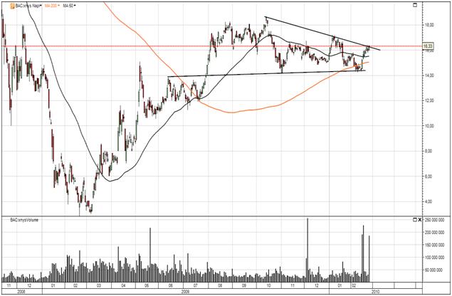 Nagyon a kitörés határán tartózkodik a Bank Of America. nagyon magas forgalommal próbálkozik kitörni a beszűkülő alakzatból, ami hozhat némi optimizmust a részvények további emelkedéséhez.