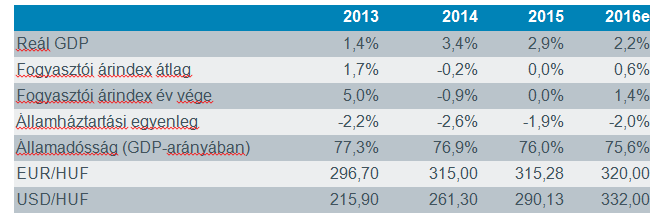 Az MNB várakozásai szerint 2016 második felétől élénkülhet a hitelezési aktivitás, amit kiegészíthet a lakáspiac felívelése, de ezen pozitív folyamatokat részben ellensúlyozhatják a külső, deflációs környezetből származó negatív hatások. 2016-ban az Equilor 2,2 százalékos GDP növekedési ütemmel számol, és egyelőre hosszabb távon sem lát olyan húzóerőt, amely gyors reálkonvergenciát eredményezhetne. Az inflációt hazánkban is elsősorban az olaj tartósan alacsony árfolyama befolyásolja, melynek hatására az 0,6 százalék lehet éves szinten. Az államháztartás hiánya tavaly alacsonyabb, 1,9 százalékos lehetett az előzetesen tervezett 2,4 százalékkal szemben, ami idén 2 százalékra emelkedhet.