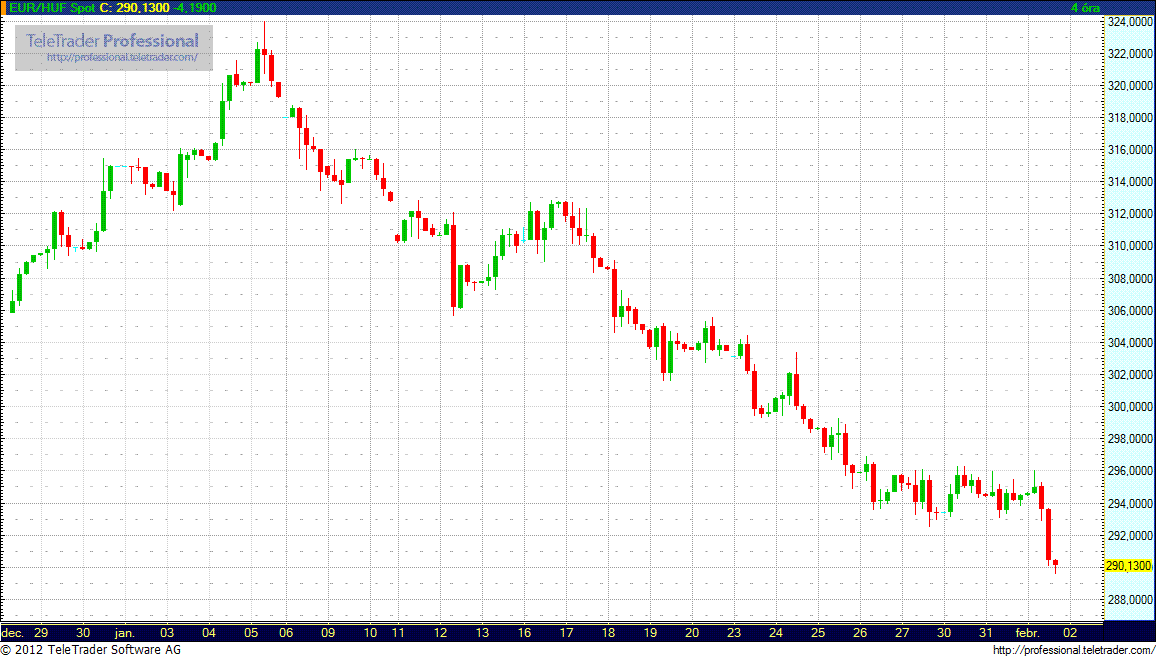 Január legelején a forint 324,27 forintos euró, 266,08-as svájci frank, 252,08 forintos dollár, illetve 3,2824-es japán jen árfolyamon is járt, ami rendre éves csúcsot jelent. Szerda délután a frankot 240,61 forinton, a dollárt 219,43 forinton, a jent pedig 2,8830 forinton jegyezték. Február elejére a forint már visszanyerte 2011-es árfolyamveszteségének mintegy felét.