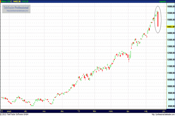 Beszakadtak a japán részvénypiacok, a 2007 decembere óta nem látott szintrekről meredeken leszakadt, a Nikkei 225 index 7,3 százalékkal 14.483,98 pontra zuhant. Ekkora esés a japán piac a fukushimai katasztrófa óta nem mutatott. A Topix index 6,87 százalékkal 1.188,34 pontra hanyatlott.