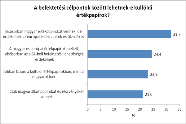 Miközben a felmérés résztvevői körében erős az érdeklődés a részvények iránt, a Budapesti Értéktőzsde forgalma továbbra is stagnál. E kutatás azonban magyarázatot adott erre az ellentmondásra is. „Kiderült, hogy egyre népszerűbbek a külföldi értékpapírok, a válaszadók 56 százalékuk egyaránt nyitott a hazai és külföldi értékpapírok iránt” – hangsúlyozta Tordai Péter. A külföldi tőzsdék közül elsősorban a kontinensen lévő értékpapírpiacokat fedeznék fel, a válaszadók 32 százaléka ugyanis a Budapesti Értéktőzsde mellett elsősorban az európai piacokat venné célba. A tájékozott befektetői rétegben meglehetősen nagy azonban az érdeklődés a tengerentúli tőzsdék iránt is, az alternatív befektetéseket keresők 24 százaléka elsősorban az USA-beli parketteken forgó papírok vagy egyéb amerikai befektetési lehetőségek között válogatna a magyar és európai értékpapírok mellett. Ugyanakkor van egy olyan réteg, amely továbbra is kizárólag magyar állampapírokba és részvényekbe fektetne, ők a válaszadók 21 százalékát tették ki.