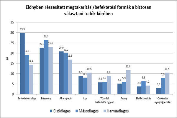 Az alternatív befektetési formák közül az aranyat és a határidős ügyleteket csak a leginkább kockázatkedvelő réteg részesítette előnyben, ez magyarázza, hogy a pénzügyi portál olvasóinak mintegy 5 százaléka választotta volna ezeket az instrumentumokat elsődleges célpontként. Nyolc-tíz százalékuk fektetett volna államilag támogatott lakástakarék-pénztárba, azonban ez az arány nagyon stabil volt, függetlenül attól, hogy első, második vagy harmadik helyen jelölték meg célpontként.